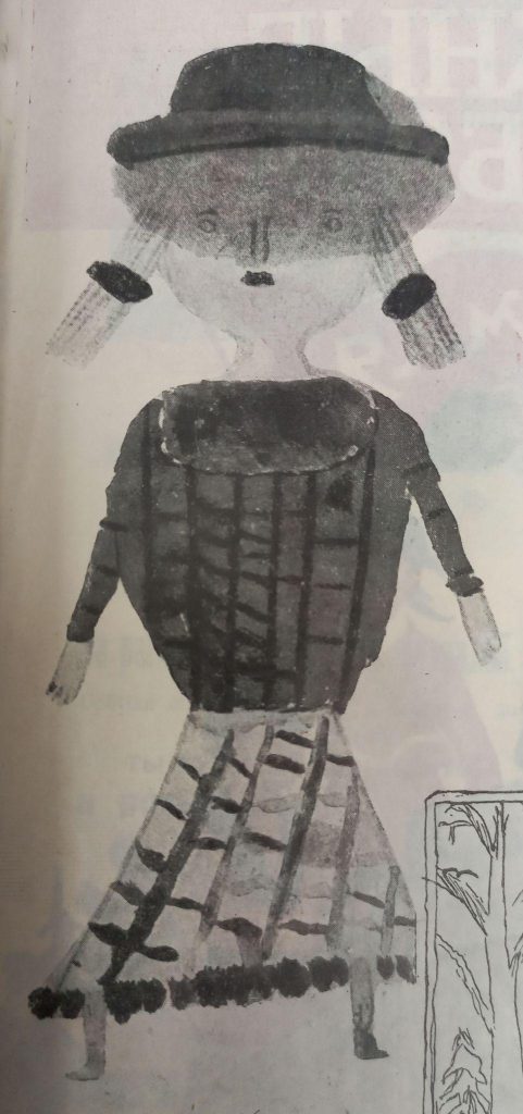 В качестве корреспонденции принимались не только тексты, но и рисунки — их использовали для иллюстраций и публиковали в рубриках «Страничка рисовальщика» и «Наша вставка». Вот такую печальную куклу изобразила 10-летняя читательница ДР. Имя художницы не указано, зато говорится, что это не «портрет» готовой игрушки, а эскиз для будущей поделки.
