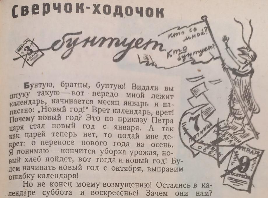 Чем только не занимался неутомимый стихоплет! В 1930 году (№ 1) он взбунтовался против нового года и — бери выше — календаря в целом. Не так важно, согласны мы со Сверчком или нет. Главное — какая экспрессия, какой задор.