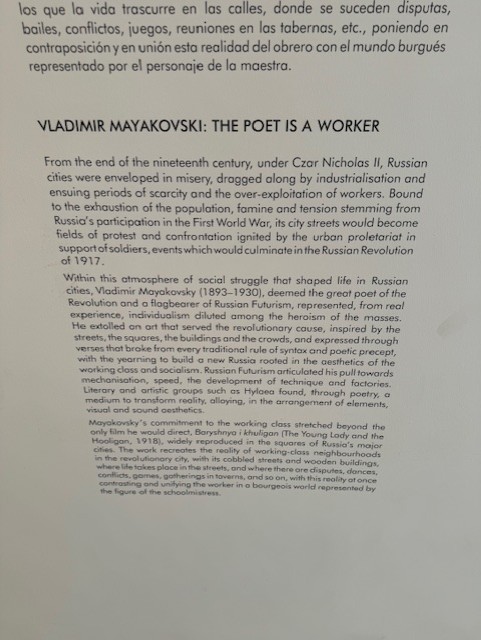 Но славянская (здесь: российская) тень бежала впереди меня. Так, выяснилось, что в удивительном Reina Sofia (испанский авангард от кубизма до сюрреализма и дальше) есть целый зал, посвященный Владимиру Маяковскому (зал 208.01 Vladimir Mayakovski: el poeta es un obrero, то есть «Владимир Маяковский. Поэт — это рабочий»).