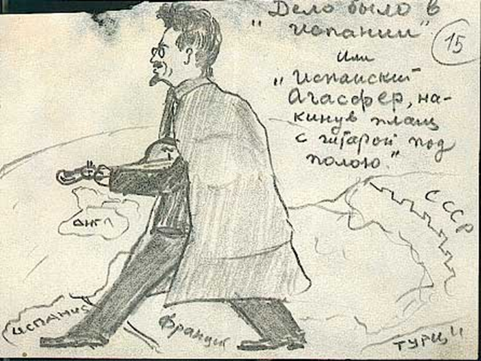 «— Я должен сказать вам несколько слов по поводу этой самой Испании. Ко мне часто обращаются, особенно девушки: „Ах, какой вы счастливый, вы были в Испании, какая очаровательная страна! Там тореадоры, быки, испанки и вообще много страсти“. Я тоже был готов к тому, чтобы увидеть что-нибудь в этом роде. Но ничего подобного. Пароход подплыл к испанскому берегу, и первое, что мне бросилось в глаза, — это довольно прозаическая вывеска грязного склада „Леопольдо Пардо“. Правда, веера у испанок есть, — жарко, вполне понятно. А так ровно ничего примечательного, если не считать, что по-русски — телефон, а по-испански — телефонос…» [3].