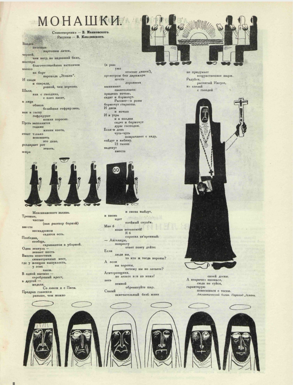 Вернемся на борт «Эспани». Особое — доходящее до физиологического — раздражение у поэта почему-то вызвали путешествующие в первом классе парохода, где находилась его каюта, какие-то испанские монахини. Их Маяковский подвергает словесному поруганию в стихотворении «6 монахинь», рассказывающем об идентичных машинообразных сестрах и включающем аллюзию на непристойную шутку Чацкого по отношению к московским щеголям: