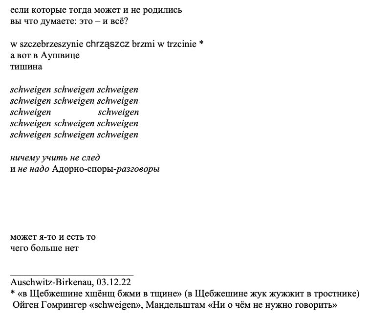 Поэтому мне очень важно акцентировать понятие места появления. Это можно возводить, например, к гомрингеровскому молчанию, к затекстовому пространству у Некрасова или у Геннадия Айги. Молчание Ойгена Гомрингера — это то же самое затекстовое пространство. Это то, что за текстом, но на самом деле очень активно. Оно творчески заряжено и активно, именно в нем происходит формирование того, что потом становится твоим текстом, поэтическим текстом.