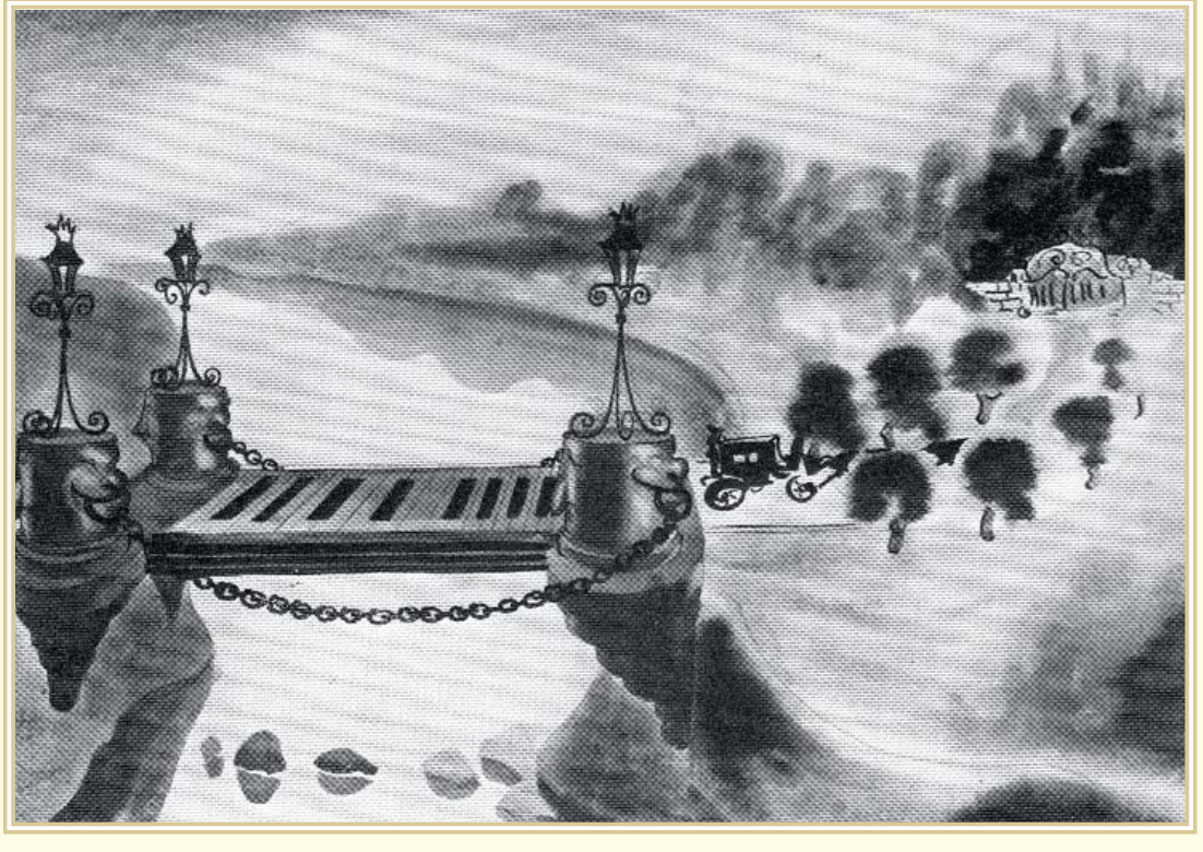 Музыка этой песенки, вовлекающей в пляску всех придворных сказочного королевства, была написана советским композитором Антонио Спадавеккиа (какая сказочная в духе Commedia dell’arte фамилия!) [1] на слова самого Шварца. Звучать в фильме эта мелодия начинает еще до исполнения песенки, когда Золушка в золотой карете приближается к сказочному замку, причем звучит она не случайно, а, так сказать, по законам сказочной страны, выдуманным автором. Дело в том, что в киносценарии Шварца описывается необыкновенный мост-клавир перед дворцом, построенный таким образом, что, «когда гости приезжают, доски его играют веселую, приветливую песню, а когда уезжают, то они играют печальную, прощальную» [2].