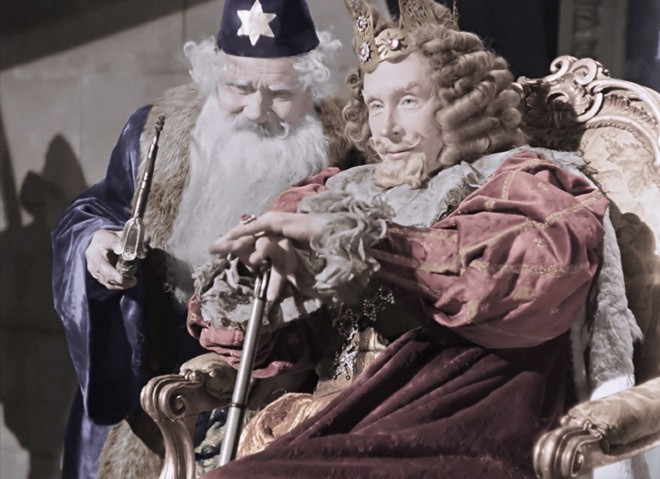 Еще раз вспомним эстетизированную христианскую подоплеку «Золушки» Шварца (чудо, душа, познание самой себя, венчание, крестная, трубы ангелов-вестников, мотив Страшного суда) и обратим внимание на странный орден в виде бриллиантового восьмиконечного креста (мальтийского рыцарского? прусского военного? того, что потом будет висеть на груди Штирлица или такого же, полученного Мальчишом-Плохишом от Главного Буржуина в фильме 1964 года?) на подвеске короля сказочного королевства в фильме (этот крест несколько раз появляется на экране советской кинокартины), а также на жукообразные (солярные?) образы на его короне, перстне и драгоценной цепи (все костюмы героев были выполнены по эскизам близкого Шварцу Н. П. Акимова):