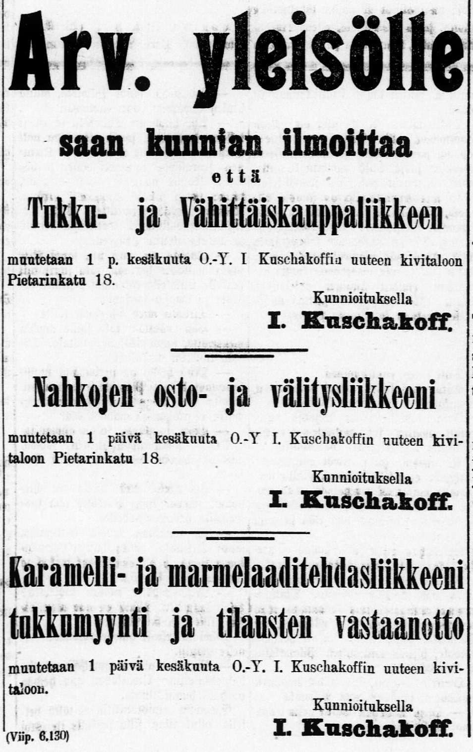 Исаак Кушаков родился в 1856 году в финском городе Хамина. Торговое дело он действительно открыл в 1879 году (31 мая). В 1903 году по проекту архитекторов Алекса Рути и Герхарда Сольберга (мужа сестры Кушакова) в Выборге для его предприятий был выстроен четырехэтажный дом в стиле финского национального романтизма[12]. В июне 1904 года сюда были переведены основные предприятия Кушакова, и в выборгской газете «Karjala» появилось соответствующее объявление (оригинал на финском языке):