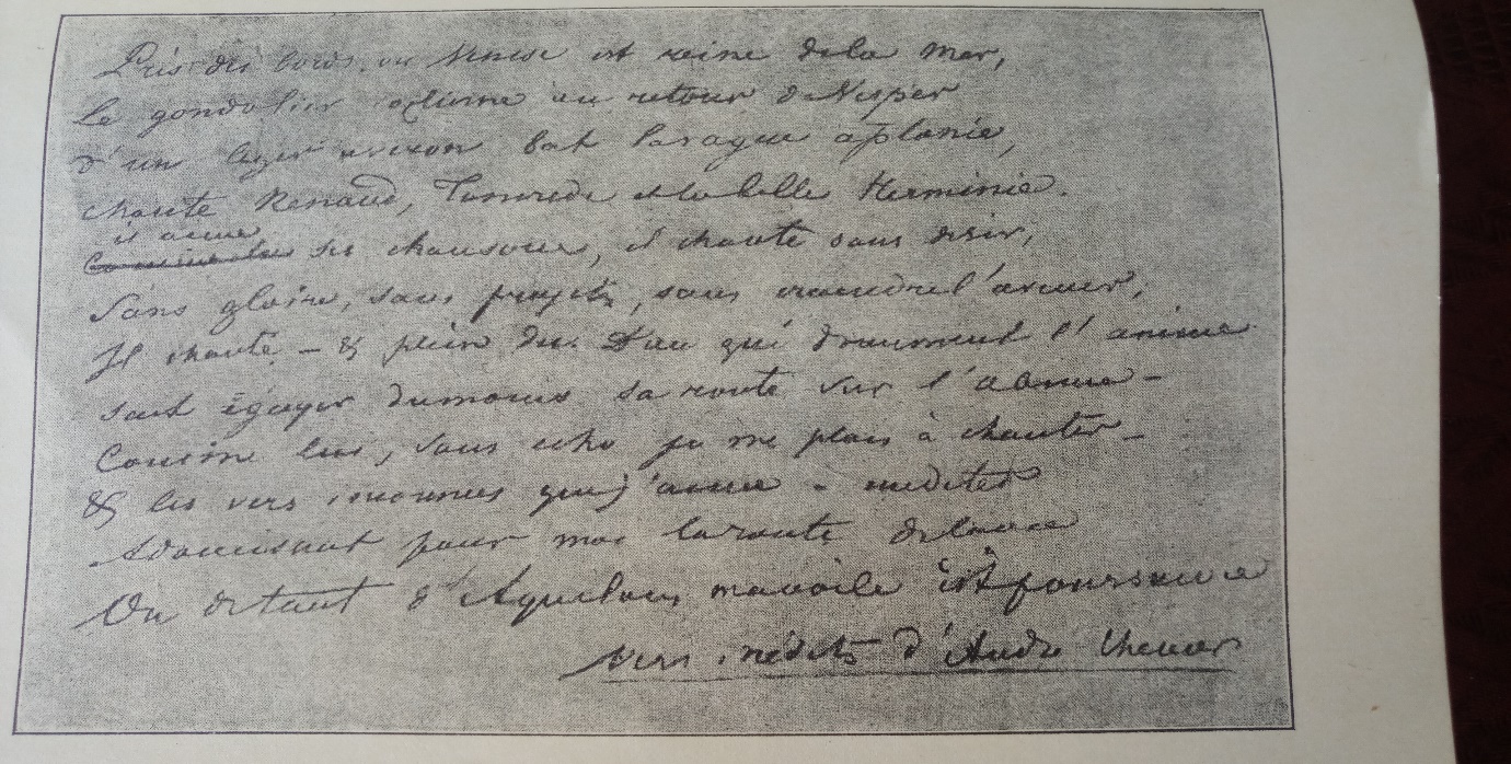 Пушкину принадлежат и переводы из Шенье. Так, он сразу после журнальной публикации во Франции в 1826 г. неизданного стихотворения Шенье «Près des bords où Venise est reine de la mer…» («Близ берегов, где Венеция — царица морей») перевел его («Близ мест, где царствует Венеция златая…»).