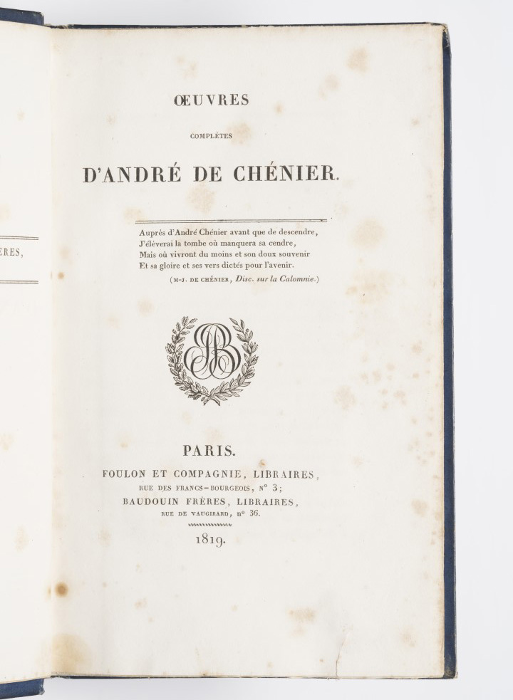 — В сборнике сочинений 1819 года, вышедшем лишь спустя двадцать пять лет после смерти Шенье, поэт предстал как автор светлых, мелодичных пасторалей, элегий, отмеченных простодушной открытостью, и проникновенных, предсмертных од и ямбов, «оправдавший», как писал И. Ф. Анненский, легенду об Орфее. Судьба Шенье вписывалась в романтический миф о роковой обреченности поэта на раннюю гибель. Соответствующие акценты были расставлены в предисловии издателя собрания сочинений 1819 г., поэта и прозаика Анри де Латуша. В печати сборник Шенье приветствовали французские поэты, признанные вскоре как романтики, среди которых были Виктор Гюго и Альфонс де Ламартин. Шенье воспринимался ими как предтеча новой школы. Обсуждение в прессе касалось в первую очередь именно вопроса о том, в какой мере он предвосхитил романтическую поэзию. О его романтизме писал П. А. Вяземский, а Пушкин в споре с ним называл Шенье «из классиков классик». Его поэзия действительно тесно связана с греческой и александрийской, с римской элегией, с одами Горация. Шенье привязан в своих стихах к чувственно воспринимаемому, земному миру, к его радостям, непреходящим и в силу неизбежности смерти, поскольку всех связывает любовь и память. У него нет никаких следов романтической мировой скорби, зато есть определенная дань французской «легкой поэзии» XVII-XVIII в. с ее галантным кодексом любви, цветами и амурами, призывом «ловить день», акцентом на плотских утехах. Крушение созданного в стихах мира происходит затем в ямбах Шенье не по причине некоего вселенского разочарования, а вследствие конкретного события: революционной катастрофы.