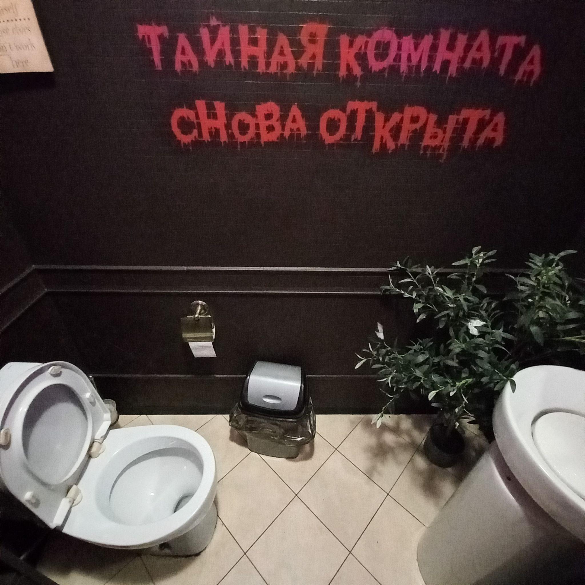 Попиваю какао из маленького котелка с надписью «ведьмино варево» и любуюсь гик-обстановочкой. Волшебные палочки, совы и прочие распределяющие шляпы — кошерно, чего уж там. Чтобы погружение было полным, захожу в туалетную комнату, где радует глаз кровавая надпись во всю стену: «Тайная комната снова открыта». То ли это отсылка к книге и, в частности, к тому, что дурно воспитанный василиск, обитавший в комнате, путешествовал по трубам (до сих пор не понимаю, как это для гигантской змеи возможно вообще), то ли толстоватый намек на то, что Волан-де-Морт и его союзники, мягко говоря, продукты распада.