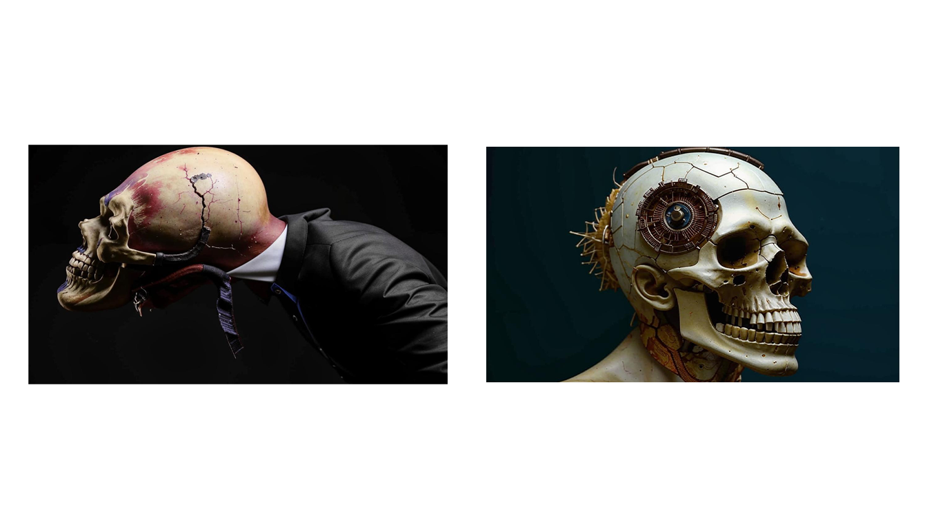 С иллюстрацией здесь вышла интересная вещь. Сперва нейросеть изобразила понурые цветы с оторванными бутонами, будто говоря, что только растение способно продолжить существование в подобном виде. А затем упрямо, раз за разом, рисовала деформированный череп, явно намекая, что даже ее могущества для оживления человека без головы на сегодняшний день недостаточно.