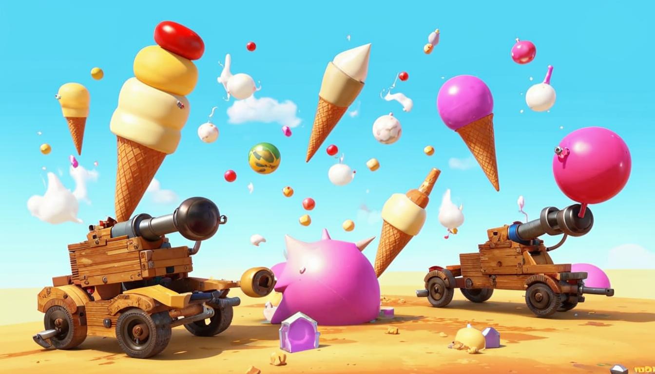 Нейросеть долго отказывать рисовать по мотивам желания Нины что-то путное — видимо, оно действительно почти невыполнимо. Приходилось раз за разом переписывать запрос, сводя его к самой сути. Наконец, получилась такая картинка. Смотри, Нина, вот они придуманные тобой самые правильные в мире пушки:
