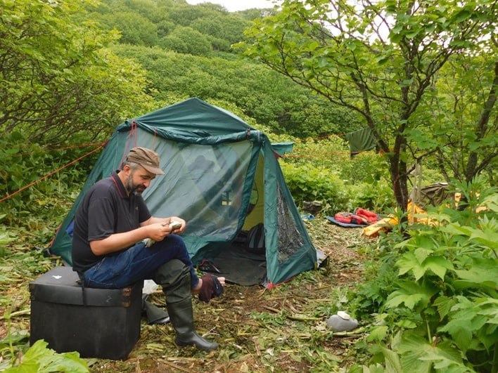 Мы ходили по этой тропе, ловили сетями птиц, кольцевали их, определяли подвиды. Были и занятия таксидермией. Дары для этих занятий предоставляло нам, в числе прочих, море. Есть фотография, на которой я вне палатки препарирую крыло чайки, найденное в бухте, а на ноге у меня пытаются сушиться носки, которые я чуть раньше благополучно промочил. Хочу отметить, что Курилы — ни разу не курорт: это очень холодное место с практически стопроцентной влажностью, поэтому условия были те еще.