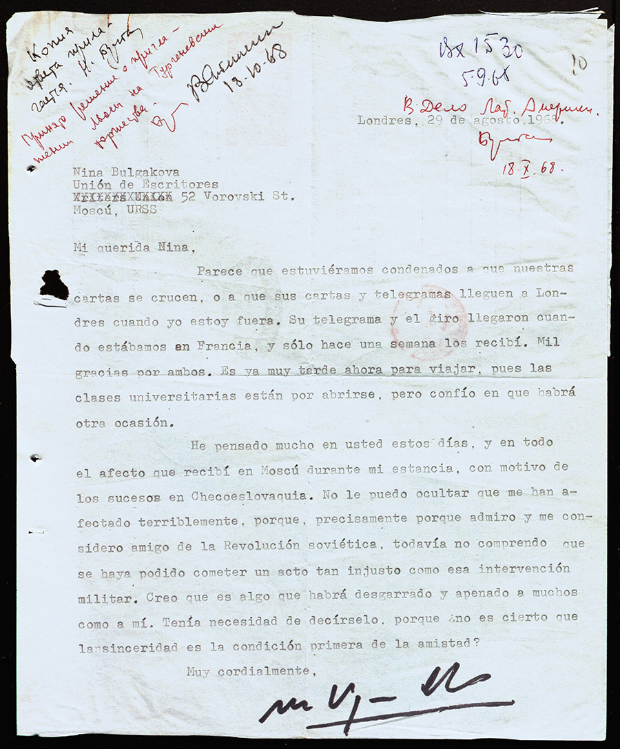 Я еще не устала удивляться тому, как много деталей можно восстановить применительно к истории шестидесятилетней давности — например, кто кому передал какую информацию, кто привез рукопись и так далее. Так, мы с Карлосом знали, что после 1968 г. Варгас Льоса вновь где-то виделся с Ниной Булгаковой (консультантом Союза писателей по латиноамериканской литературе), но где? Мы дотошно сопоставили все выезды Булгаковой с перемещениями писателя. Задача нетривиальная, потому что последний был неуловим даже для друзей. Перебрав все варианты, предположили, что это была случайная встреча в одном из южноамериканских аэропортов на пересадке. С нынешним количеством рейсов это кажется невероятным, но тогда их было не так много. Каков же был наш восторг, когда позже нашлось письмо Булгаковой, которая упомянула эту знаменательную встречу в аэропорту Каракаса! Вот так мы были вознаграждены за свои поиски.