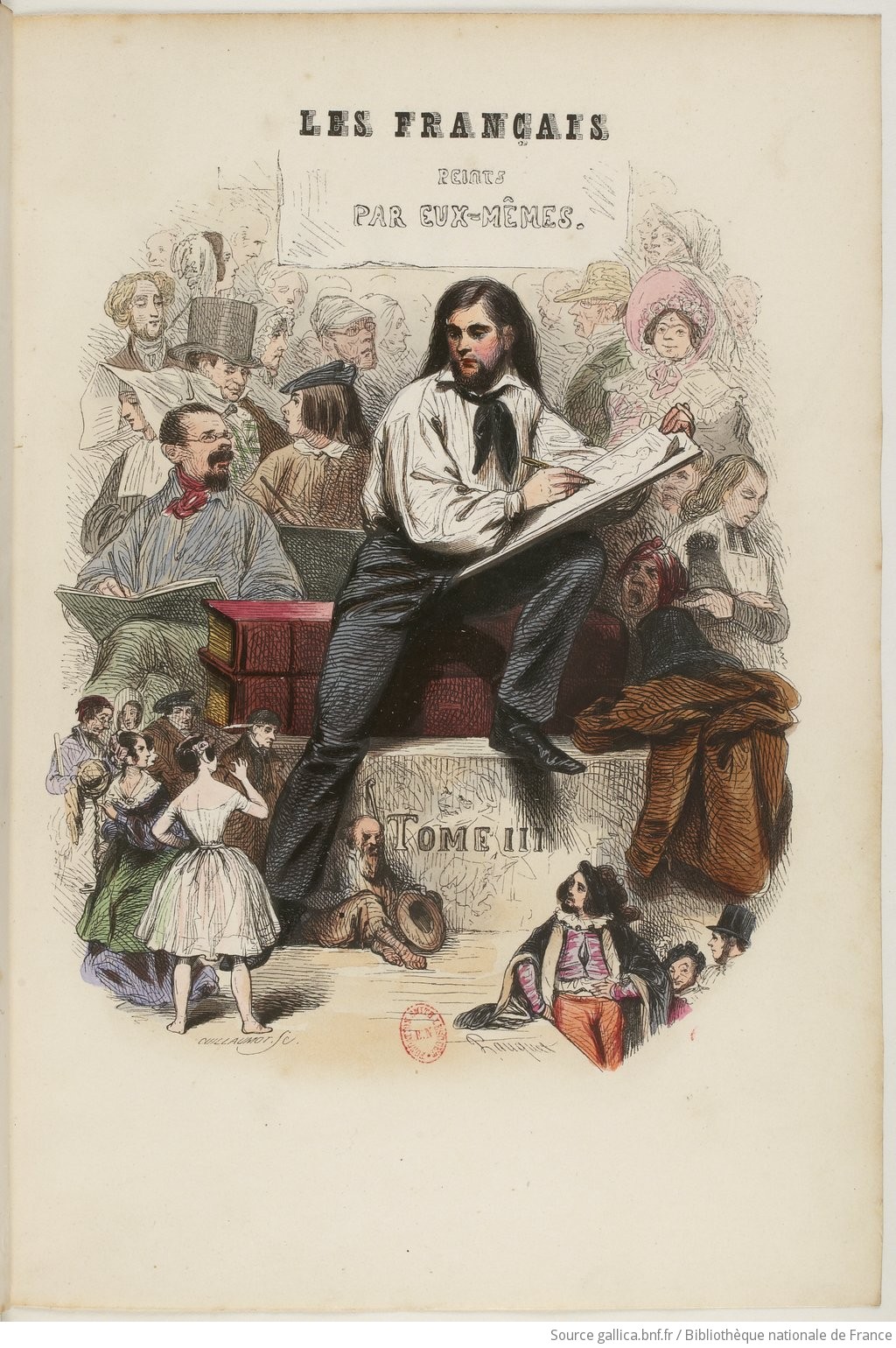 В моем предисловии к книге 2014 года можно найти более подробный рассказ о том, что задумал и осуществил издатель Кюрмер. Здесь я лишь коротко перечислю основные особенности его, выражаясь современным языком, проекта. В 1830-е годы французов, и прежде всего парижан, охватила, по выразительному определению французского историка Жюдит Лион-Каэн, «эпидемия коллективного самоанализа». Вышли пятнадцатитомное издание «Париж, или Книга Ста и одного» (1831–1834) и семитомная «Новая картина Парижа» (1834-1835). В этих книгах очерки, посвященные людям, соседствовали с рассказами об определенных местах и заведениях. Тем временем в Англии с 1838 года выходила — сначала, как это было заведено в ту эпоху, отдельными выпусками — книга Heads of the People, or Portraits of the English; название это принято переводить как «Образы народа, или Портреты англичан», хотя слово head дословно означает голову или лицевую сторону монеты с изображением головы, и в книге каждый очерк в самом деле сопровождался поясным портретом героя, то есть, в сущности, его головы. Это был коллективный сборник — описания разных английских типов с иллюстрациями художника Кенни Мидоуза. Кюрмер в 1839–1840 годах выпустил его французский перевод с теми же иллюстрациями, но с новым названием: «Англичане, нарисованные ими самими». Но на этом он не остановился и захотел повторить тот же опыт применительно к своим соотечественникам. Задуман был один том из 48 выпусков, но в результате получилось целых девять томов, опубликованных (тоже первоначально отдельными выпусками, которые в конце года переплетались в цельный том) с мая 1839 по конец 1842 года под общим названием «Французы, нарисованные ими самими. Моральная энциклопедия XIX века»: четыре тома, посвященных Парижу, три — посвященных провинции, один (пятый) — включающий в себя статьи об армии, а также некоторые другие из категории «разное», и, наконец, бесплатный девятый том под названием «Призма», приютивший мелкие статьи, не поместившиеся в основные тома. Книга была иллюстрированная, по примеру английского издания, но если у англичан художник был один и ограничивался «головами», то Кюрмер пригласил разных художников, и рисовали они ростовые портреты своих персонажей; именно такие портреты именовались «типами».