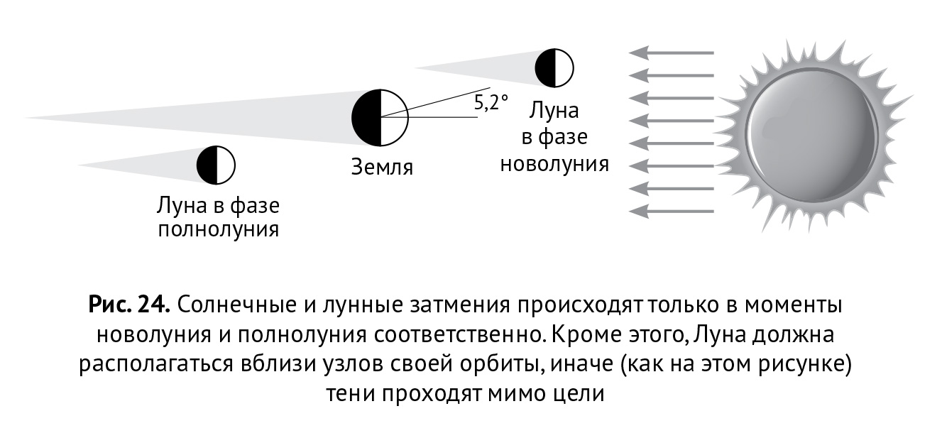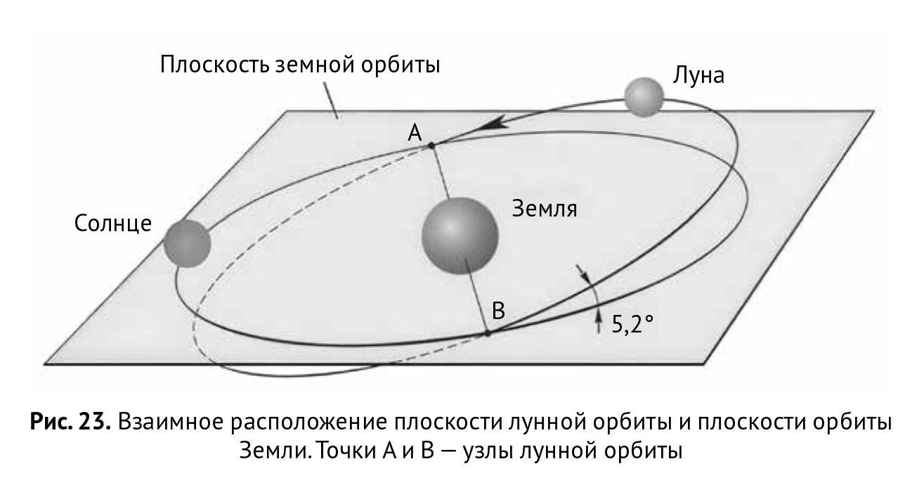 А теперь вернемся к лунным и солнечным затмениям. Если бы Луна двигалась в плоскости эклиптики, то есть в плоскости земной орбиты, то и солнечные, и лунные затмения происходили бы регулярно одно за другим каждые две недели. Однако лунная орбита не лежит в плоскости эклиптики. Затмения как Луны, так и Солнца происходят лишь в те моменты, когда Луна проходит вблизи линии узлов своей орбиты, то есть пересечений ее орбитальной плоскости с плоскостью эклиптики (в которой всегда находится Солнце). Вблизи узлов для земного наблюдателя Луна проходит дважды в месяц, но для затмения нужно, чтобы в эти же моменты и Солнце тоже оказалось вблизи одного из узлов. Если это тот же узел, где находится Луна, то наблюдается солнечное затмение, а если противоположный — то лунное.