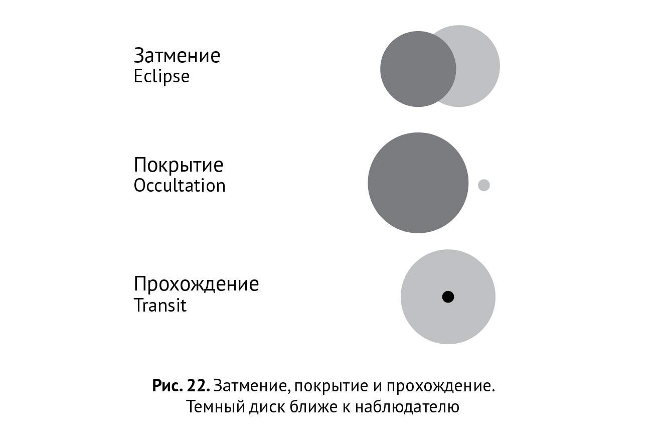 Вообще говоря, в астрономии есть три разных термина, описывающих ситуацию, когда два объекта в проекции совмещаются на небе. Мы используем тот или иной из этих терминов в зависимости от того, каков относительный угловой размер этих объектов. Если их угловые размеры близки друг к другу, мы называем это затмением; если более крупный объект перекрывает собой более мелкий, то это покрытие; когда же мелкий объект проходит на фоне крупного — это прохождение, или транзит.