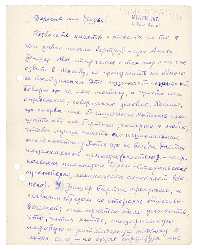 Когда-то в число учеников Донаньи в Музыкальной академии Ференца Листа входила и блестящая венгерская пианистка Анни Фишер, общавшаяся с Лукачем, а после войны посетившая с гастролями Советский Союз. Именно там ее смог услышать Игорь Сац, а после написать письмо своим друзьям Гертруд и Дьёрдю Лукачам в Венгрию.
