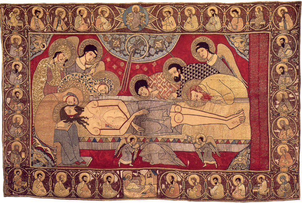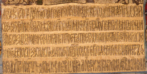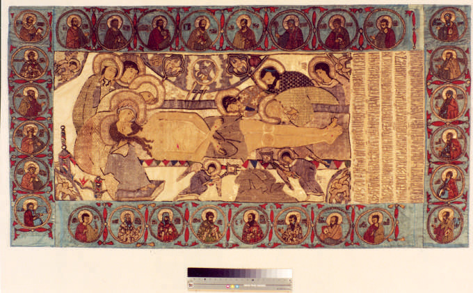 В Псковском музее-заповеднике хранится шитая плащаница (или «воздух», как вкладчик именует ее в записи) «Положение во гроб». По ее краям в медальонах располагаются вышитые изображения различных святых с указанием их имен. Кроме того, на плащанице вышита вкладная запись, из которой мы узнаем, в частности, что интересующий нас предмет в 1595/96 г. был пожертвован в Никольскую церковь Псково-Печерского монастыря: