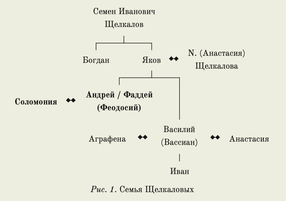 Если говорить о связанных со Щелкаловыми письменных памятниках, то, несомненно, яснее становятся и отдельные показания такого сложного типа источников, как синодики с их пресловутой лаконичностью. Так, в Синодике Крутицкого архиерейского подворья середины XVII в. в помяннике вкладчиков под рубрикой «Род Щелкаловых» приведено одно-единственное имя — Фаддей. Наше знание антропонимического досье Андрея Яковлевича позволяет определить, о ком идет речь, а заодно и предположить, что при жизни он сделал вклад по самом себе, обеспечивающий ему десятилетия поминовения по крестильному имени.