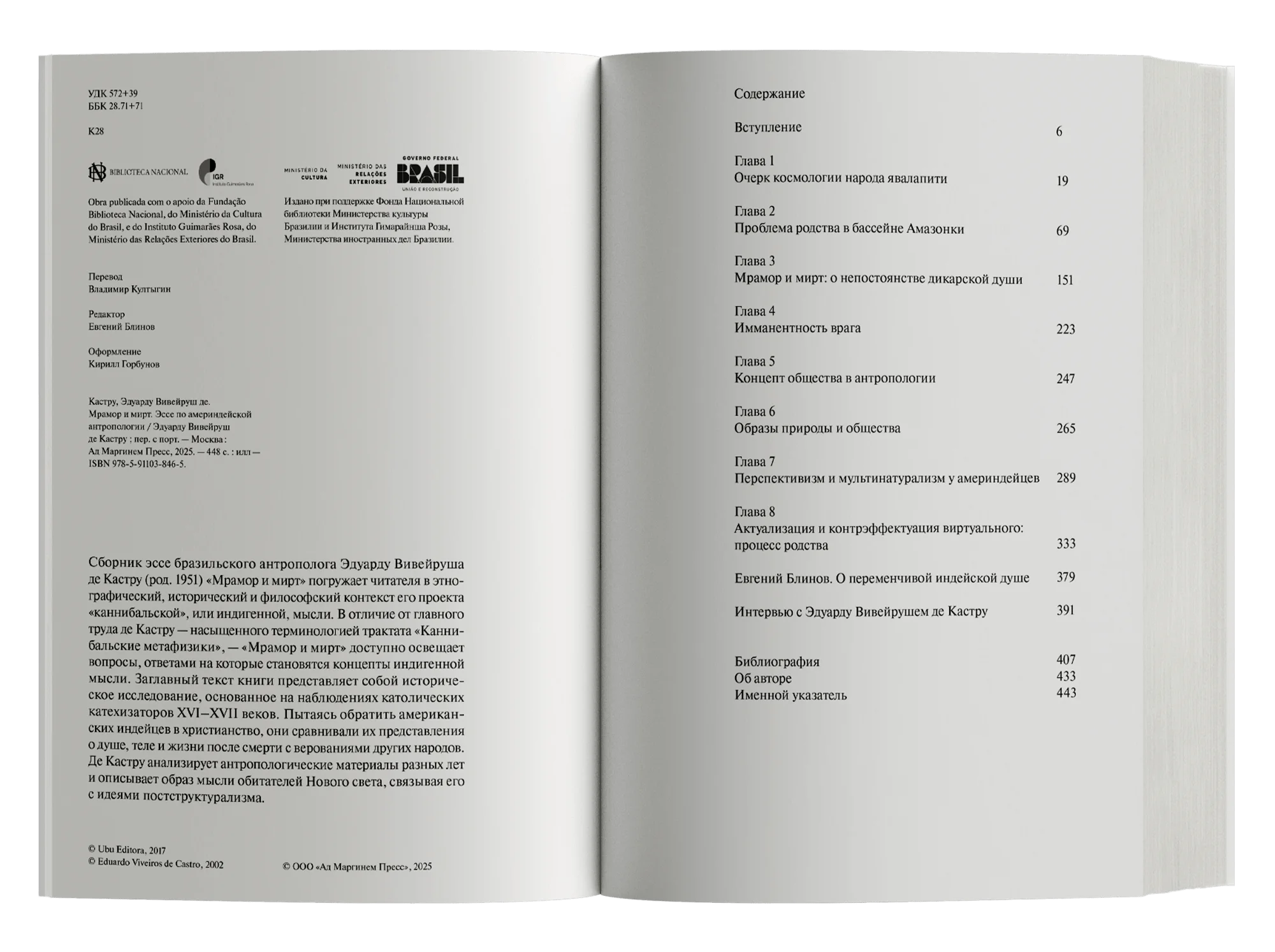 Эдуарду Вивейруш де Кастру. Мрамор и мирт. Эссе по америндейской антропологии. М.: Ад Маргинем Пресс, 2025. Перевод с португальского Владимира Култыгина. Содержание
