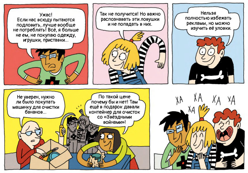 Некогда владелец лавочки — убеленный сединой Господин Бонус, чей бизнес прогорел из-за больших магазинов и маркетплейсов, — рассказывает героям историю массового потребления, начавшегося в 1950-е, когда люди бросились покупать вещи «после скудной жизни и ограничений военного времени». Тут, конечно, потребуется некоторый комментарий, адаптирующий западную жизнь к советско-российским реалиям, но в целом все узнаваемо. Затем излагаются занимательные факты о развитии рекламы — о дизайне бутылок кока-колы и «киндер-сюрпризов» в форме яиц; о мультяшных персонажах, рекламировавших шоколадный напиток «Несквик»; о компании «Хайенс», впервые придумавшей разливать кетчуп не в стеклянные, а в пластиковые упаковки, после чего «потребление кетчупа в семьях с детьми младше 5 лет выросло на 50 процентов». И так далее, вплоть до наших дней, так что последние главы посвящены гринвошингу и гендерному маркетингу.