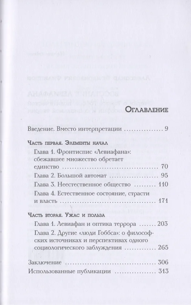 При ближайшем рассмотрении может показаться, что тема «восстания Левиафана» — лишь броская мотивировка «актуальности исследования». Она одна и правда не вносит концептуального единства. Нащупать нить, связывающую книгу в стройное повествование, не так просто, скорее это хитро сплетенный клубок разных нитей. Перед нами, как сообщает подзаголовок, очерки по широкому спектру трудных специальных вопросов, и при желании их можно читать по отдельности. Некоторые из них публиковались ранее в виде статей, но большая часть написана заново. (Особенно хочется выделить главы 3 и 4, где дается по-своему новаторская трактовка знаменитой и только на первый взгляд простой схемы перехода из естественного состояния в гражданское посредством договора.) К тому же, по признанию автора, эти очерки носят промежуточный характер и предваряют задуманное им более основательное исследование.