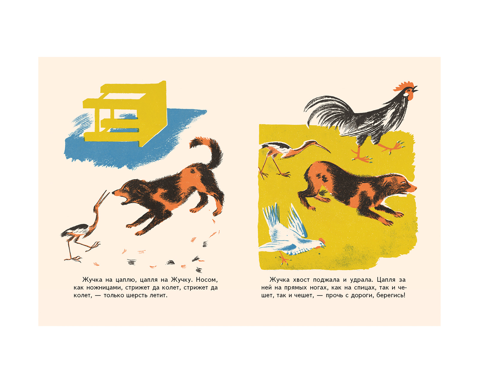 Ученик известного ксилографа Владимира Фаворского, график и поэт-футурист Георгий Ечеистов был в том числе детским иллюстратором той эпохи. В новый репринт вошли три целиком придуманные им книги «Что везет, где проезжает?», «Когда это бывает?» и «Птицы», а также совместные работы с Виталием Бианки, Агнией Барто и Павлом Пастуховым. Конечно, речь идет прежде всего о литературном памятнике, но о памятнике важном — для читателя-школьника он может стать наглядным, интуитивным погружением в историю. Иллюстрации в комплекте порой не похожи друг на друга по стилю и содержанию. Они были созданы в разное время, и заметно, насколько проще сделана, к примеру, более поздняя книжка-малышка «Когда это бывает?» по сравнению с экспрессивными рисунками к «Мал да удал» Бианки. Отдельным шедевром смотрится «Что везет, где проезжает?», изданная в 1930 году. Буйная цветовая гамма здесь соседствует с максимальной сюжетной лаконичностью, и парадоксальным образом демонстрируется чуть ли не целая панорама советской жизни, где есть место и вере в лучшее, и подспудному трагизму.