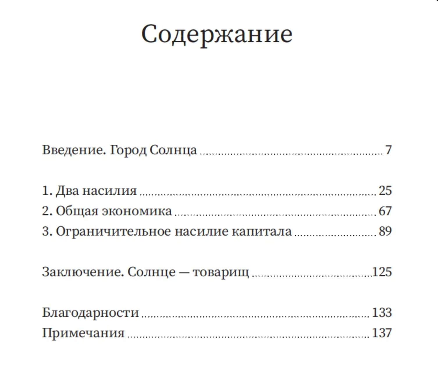 Книжка состоит из трех глав и содержательных введения и заключения. В первой главе речь идет о теориях насилия, во второй — об «общей экономике» в свете «Проклятой части» Батая, в третьей — о космологии, судьбах мира и связанных с ними фантазиях граждан вроде Кардашева, Азимова и Ильенкова. Однако с главной идеей мы встречаемся уже во Введении: солнц (если верить Платону, Марсилио Фичино, Кампанелле и, главное, тому же Батаю) — не одно, их два. Причем «два» по разным критериям: физическое и духовное, благое и злое, господствующее и угнетенное, щедро себя дарящее — и разрушительное. На этой диалектике двух солнц — или двойственности одного, — и построено изложение, которое вращается вокруг вопросов о насилии солнца, нашего собственного насилия в отношении него же (и всей планеты) — и того, что со всем этим делать.