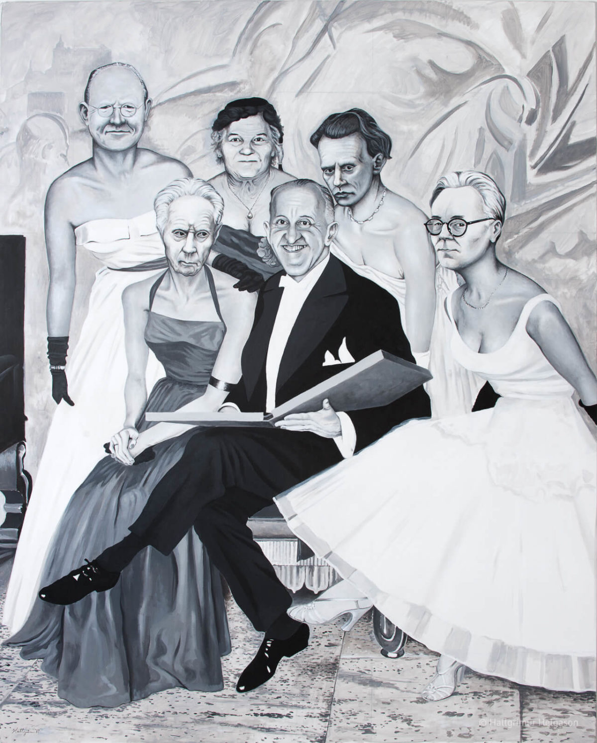 Успеху Халльдоура Кильяна Лакснесса не уступали едкие замечания и зависть современников из числа исландских литераторов, оказавшихся вытесненными на обочину мировой культуры. Объяснить неприязнь коллег банальной ревностью было бы несправедливо по отношению к действительно талантливым, если не выдающимся авторам. И исправить эту несправедливость решил Хатльгрим Хельгасон с помощью картины «Halldór Laxness w. Nobel Prize '55 and his Icelandic colleagues» («Халльдоур Лакснесс, лауреат Нобелевской премии 1955 года, с исландскими коллегами»; холст, акрил). На ней Лакснесс окружен не студентками, но другими, не менее достойными писателями.